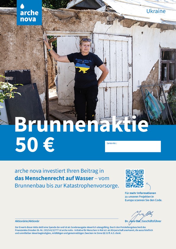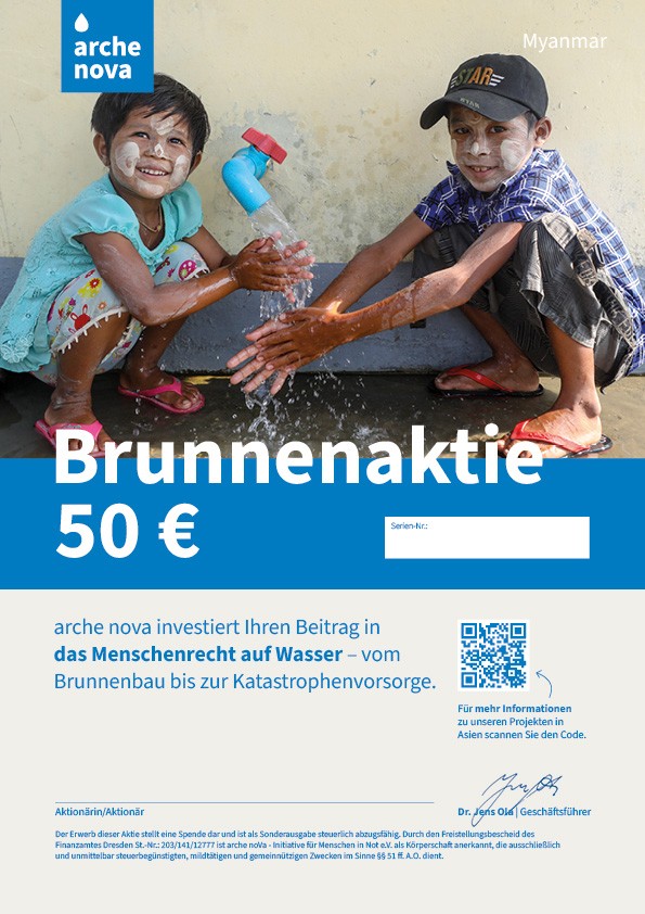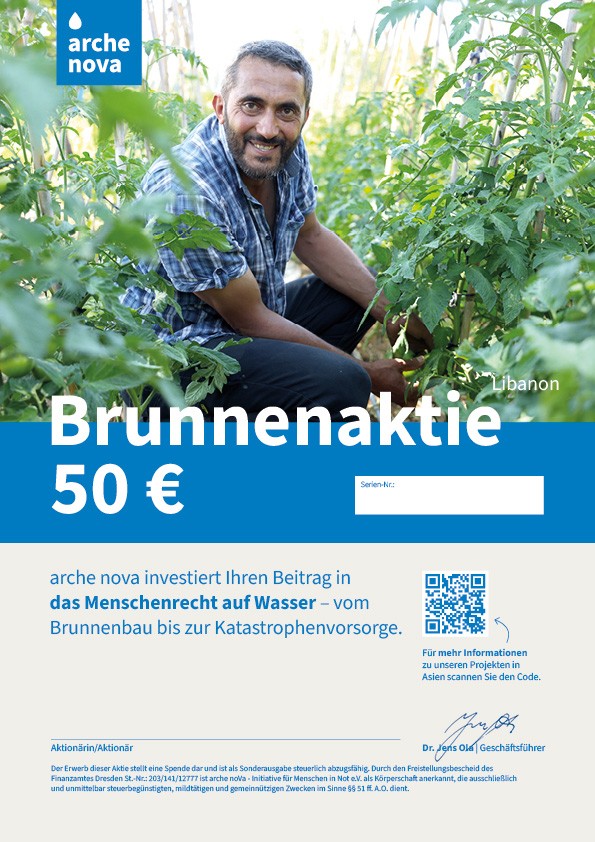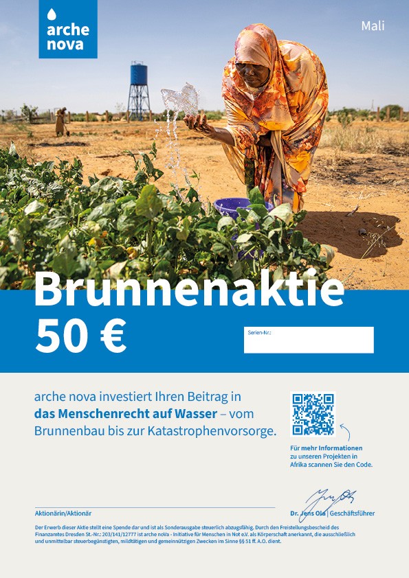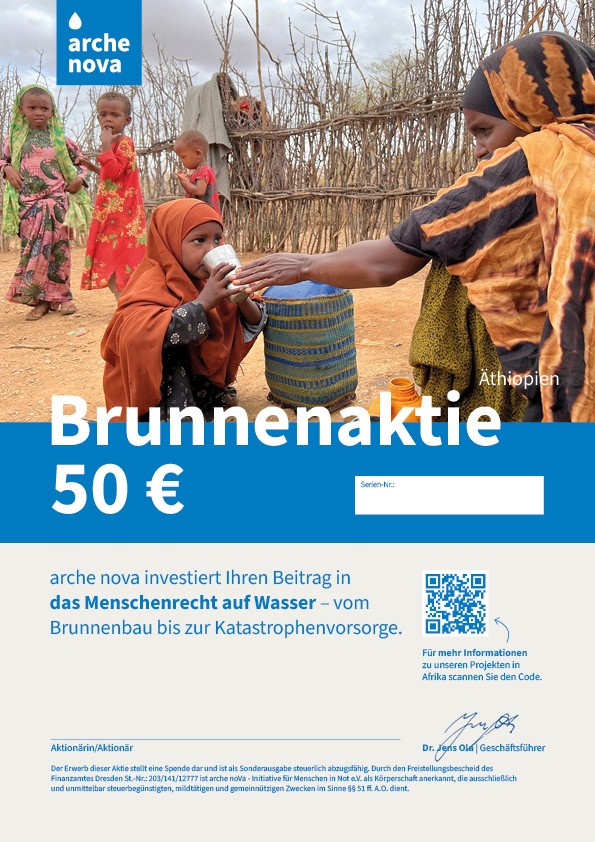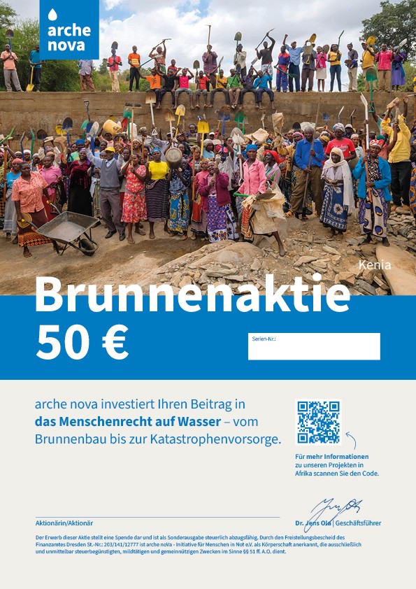 5. Die arche nova-Brunnenaktie (A4-Format) wird per Post an Sie oder eine andere von Ihnen gewählte Adresse verschickt.