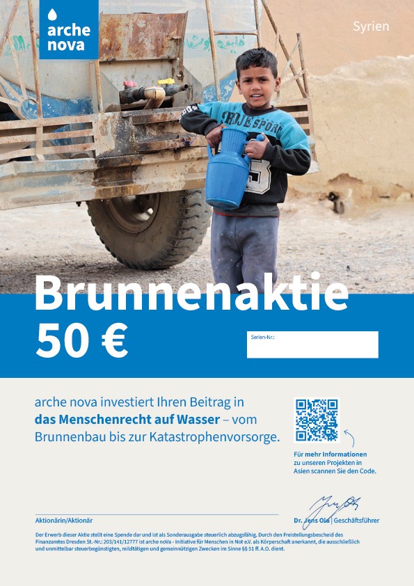 Sie wollen sich für das Menschenrecht auf Wasser engagieren? Da sind Sie bei arche nova an der richtigen Adresse. Hier können Sie in nur wenigen Schritten eine Spende in eine Brunnenaktie verwandeln und damit mehr Menschen den Zugang zu Trinkwasser ermöglichen.