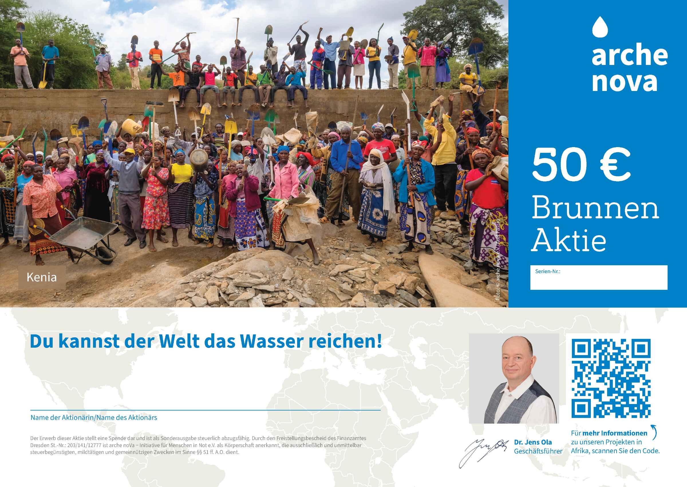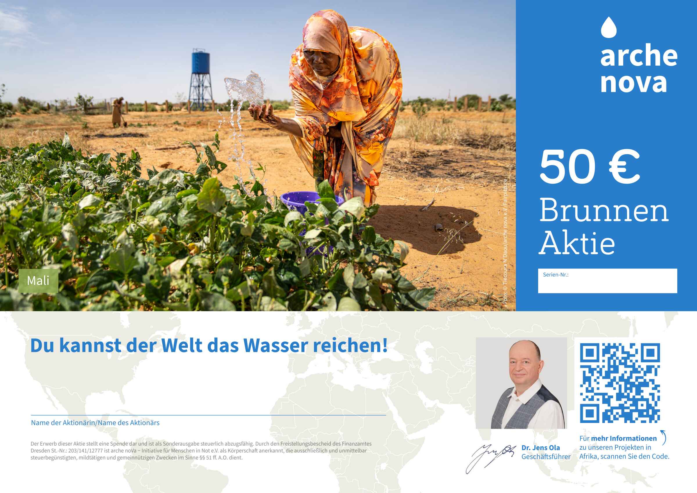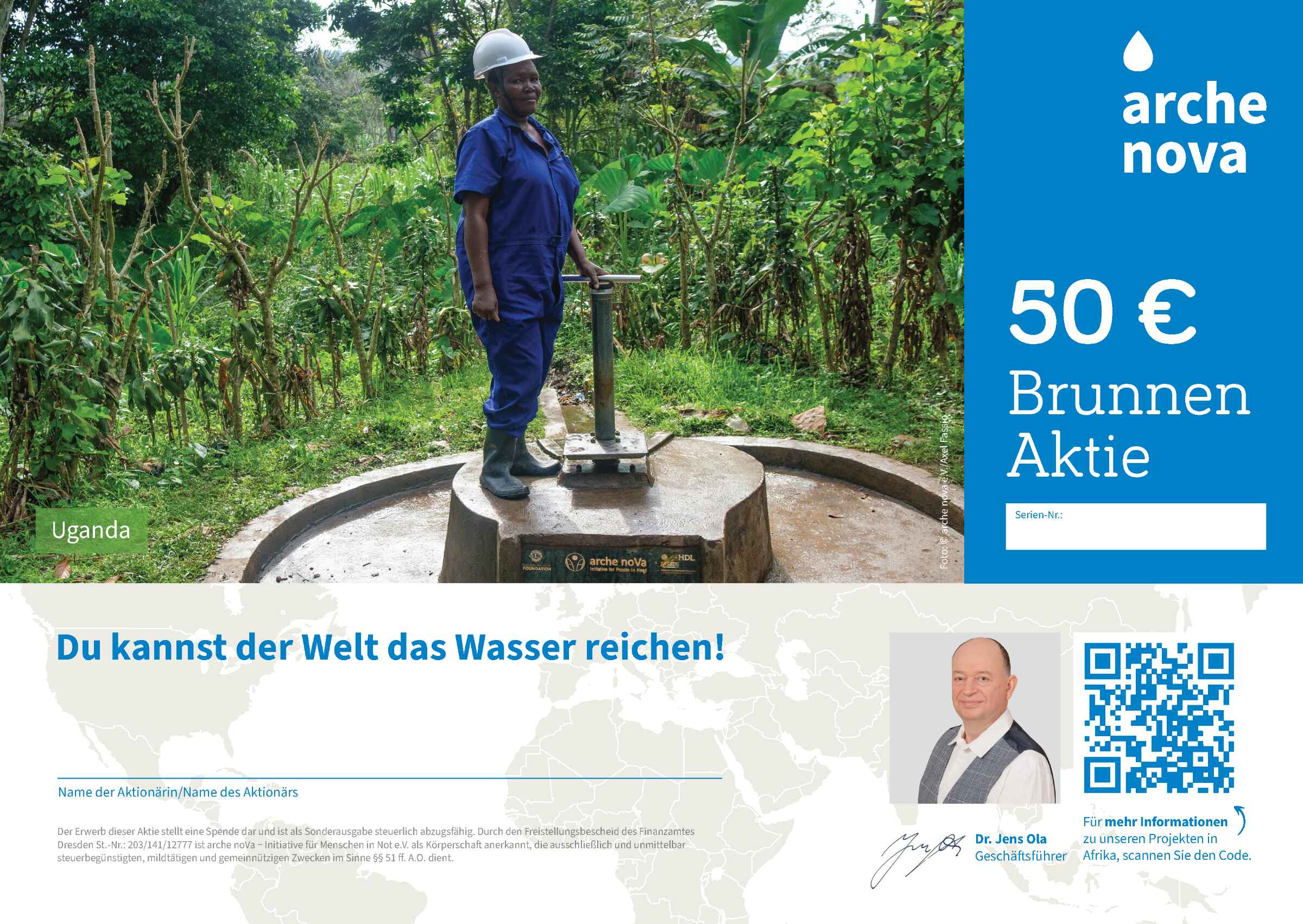 - Die arche nova-Brunnenaktie (A4-Format) wird per Post an Sie oder eine andere von Ihnen gewählte Adresse verschickt.