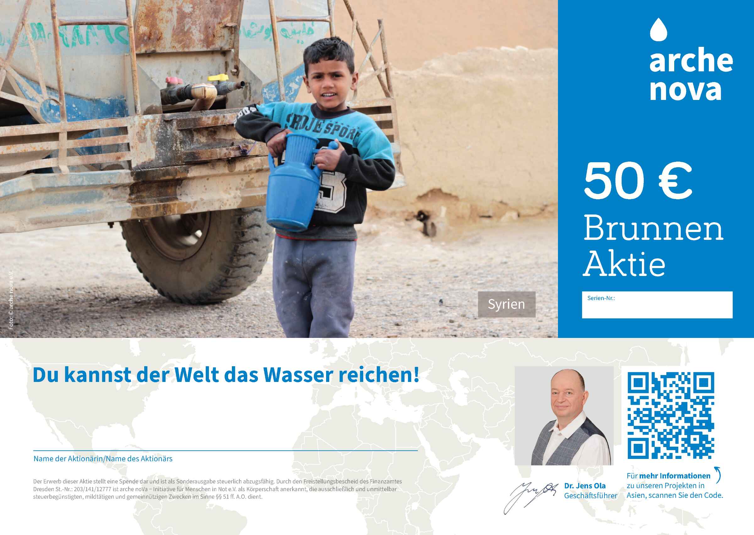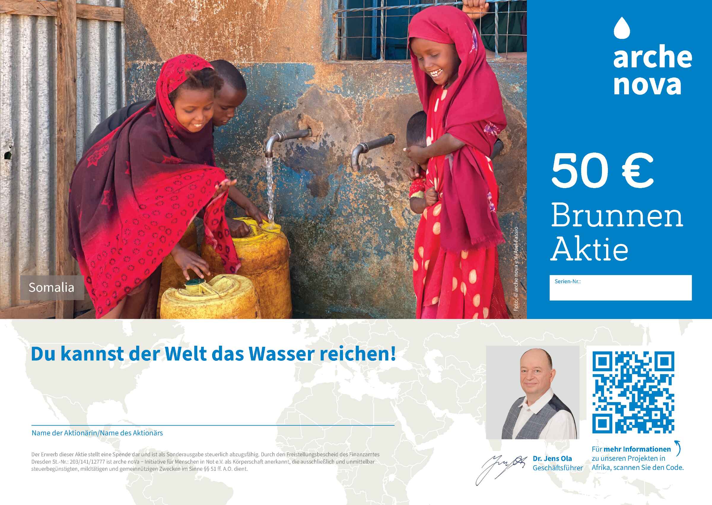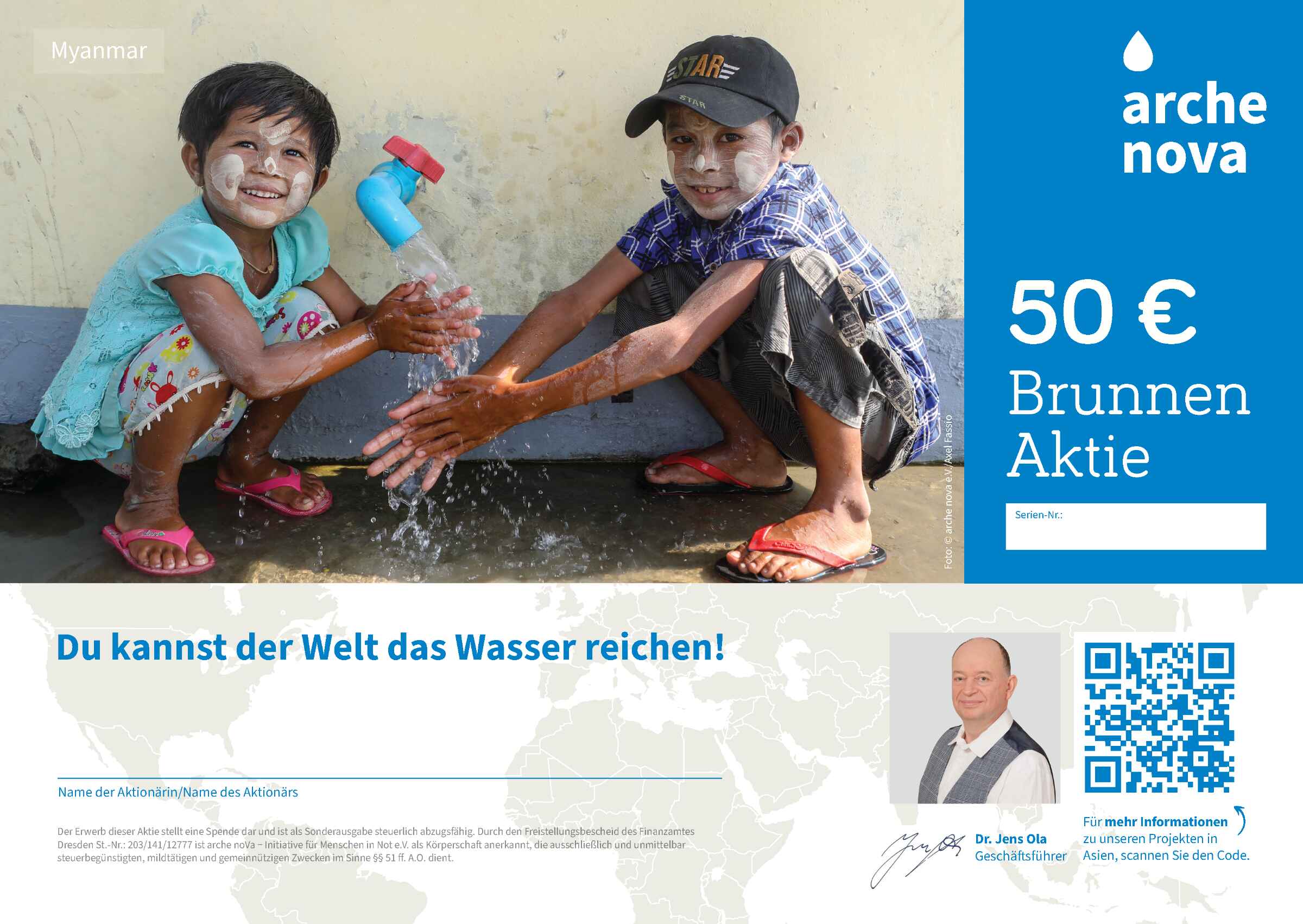 - Die arche nova-Brunnenaktie (A4-Format) wird per Post an Sie oder eine andere von Ihnen gewählte Adresse verschickt.